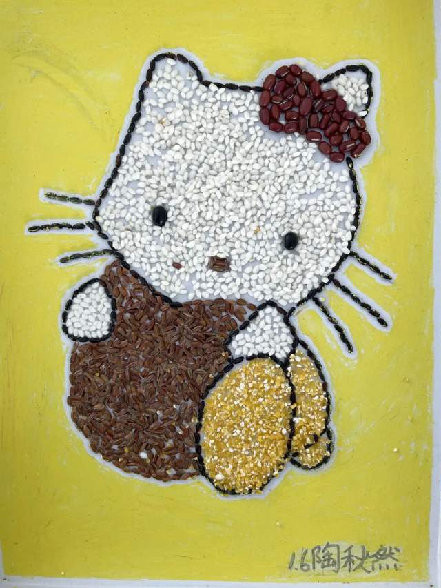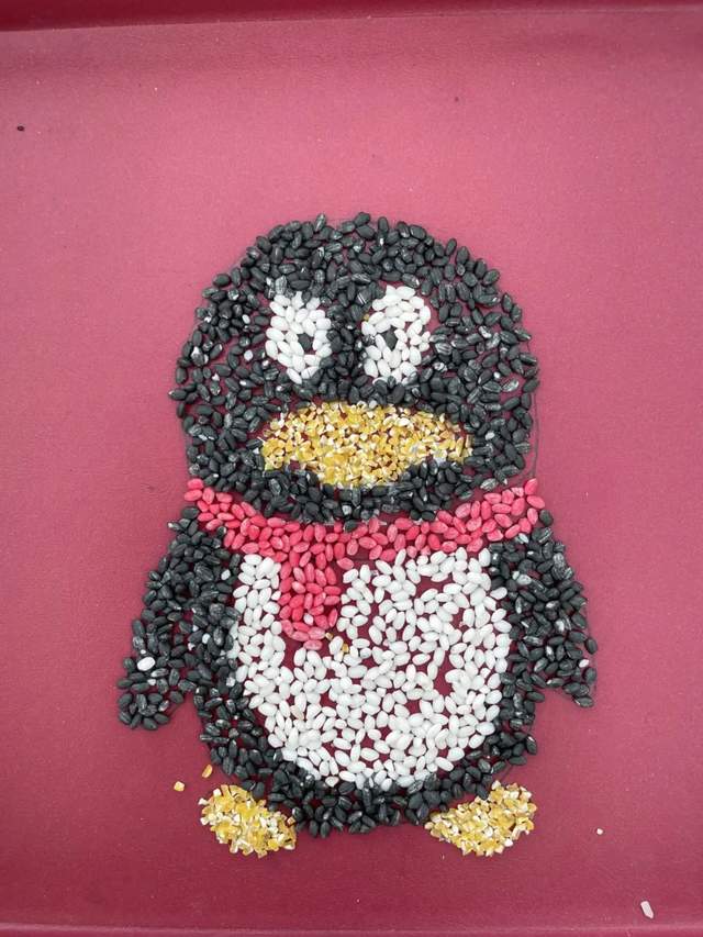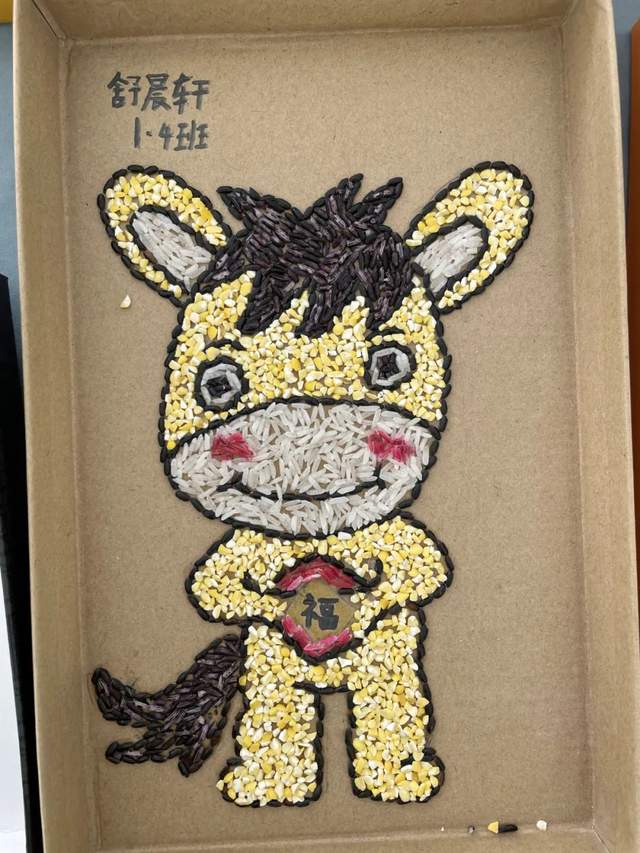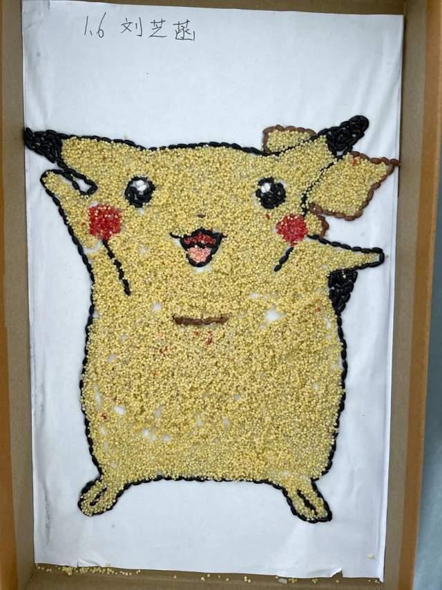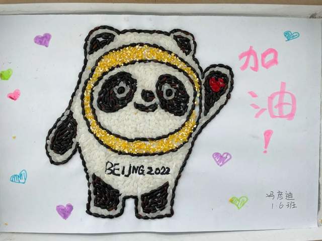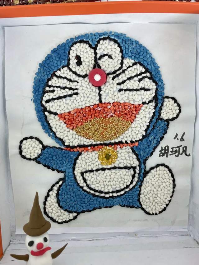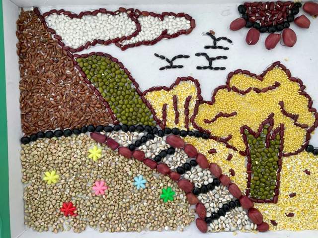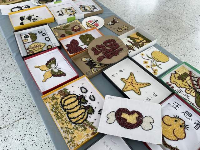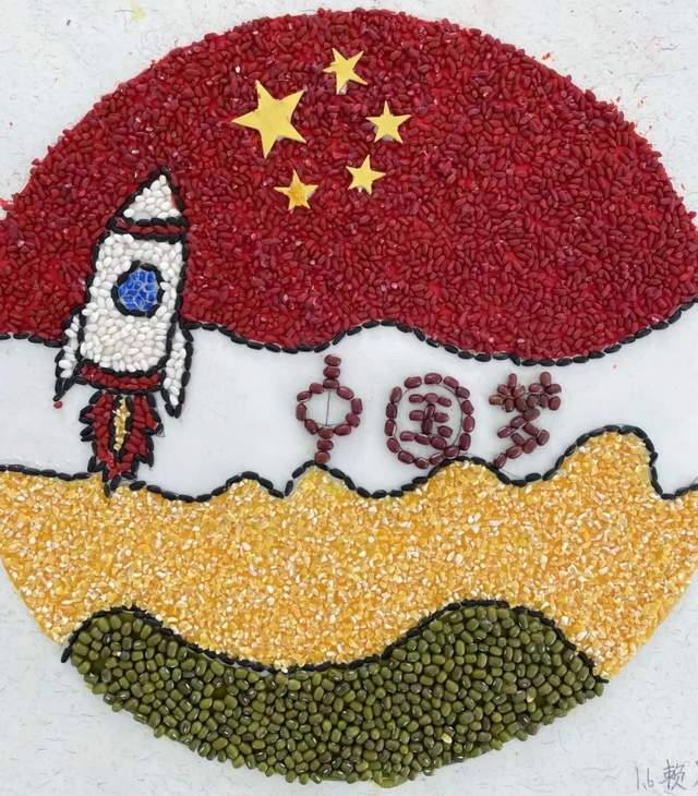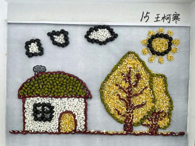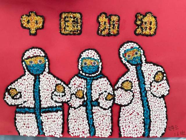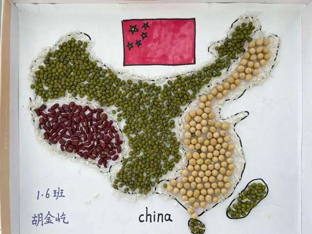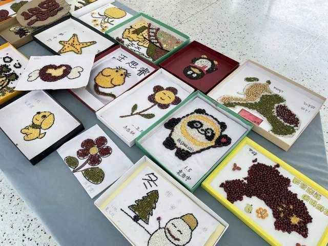 一年级“有趣的豆子”像是在科技的光环下开出的艺术之“花”,双实外的能能娃们用不同的豆子拼凑中国地图、科学防疫、中国梦等作品。