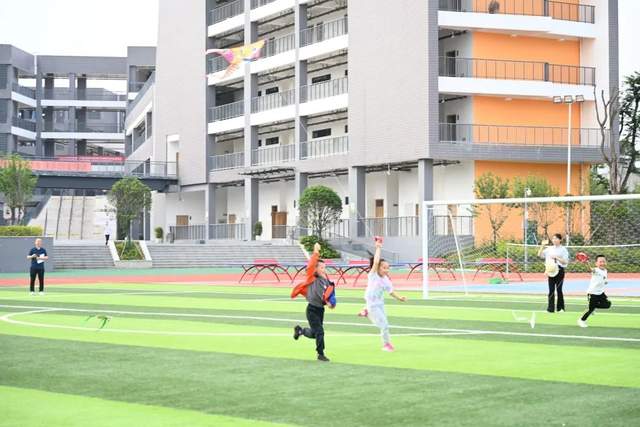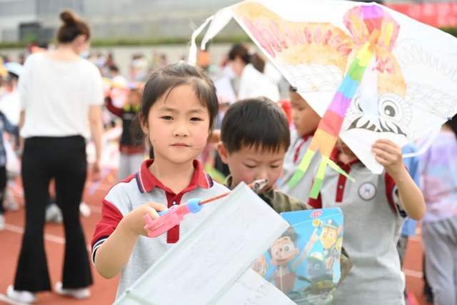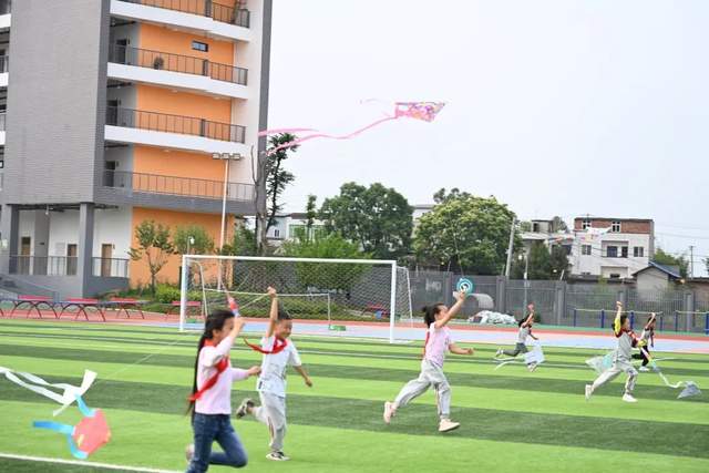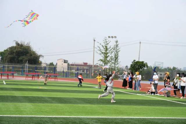 活动现场,孩子们拿着风筝迎风跑去,一个个五颜六色的风筝随风起飞、在高空中与风共舞,好不壮观;风筝们在高空中互相角逐,一“筝”高低。孩子们在绿茵场上热情奔驰,仰望天空,手中的线轴不时地转动,“放线、收线、奔跑……”,感受着“忙趁东风放纸鸢”的美好。