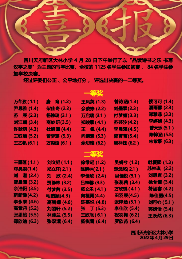 本次写字比赛活动,既丰富了学生的文化生活,培养了学生的书法兴趣,也促进了学生养成一丝不苟、持之以恒的良好写字习惯,为以后的书写打下了坚实的基础。