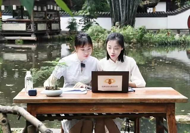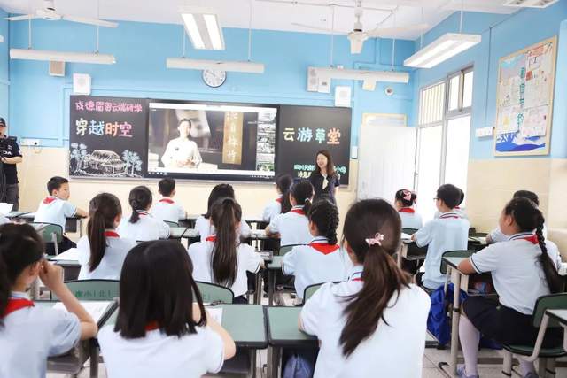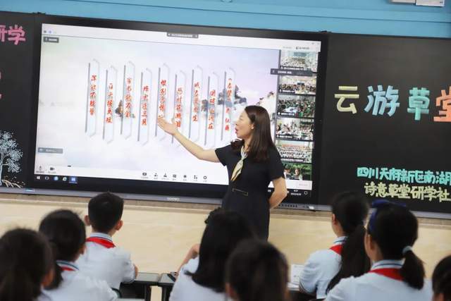 4月29日,天府新区优秀青年教师詹妍婷老师采用云端连线的方式在草堂进行直播授课;成都杜甫草堂博物馆社教专员李翼晋老师进行线上答疑;南湖小学“诗意草堂”研学社团的老师在线下管理课堂,辅助主讲完成教学和互动,并适时答疑。