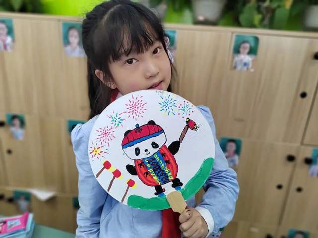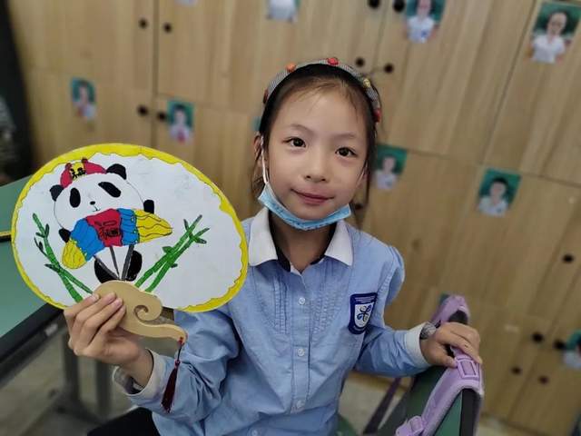 二年级小朋友的主题《熊猫故里》,使用的材料是白纸扇、马克笔。