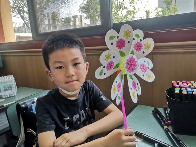 一年级小朋友的主题是《百花园》,使用的材料是纸风车、马克笔。瞧,孩子们认真地创作中!