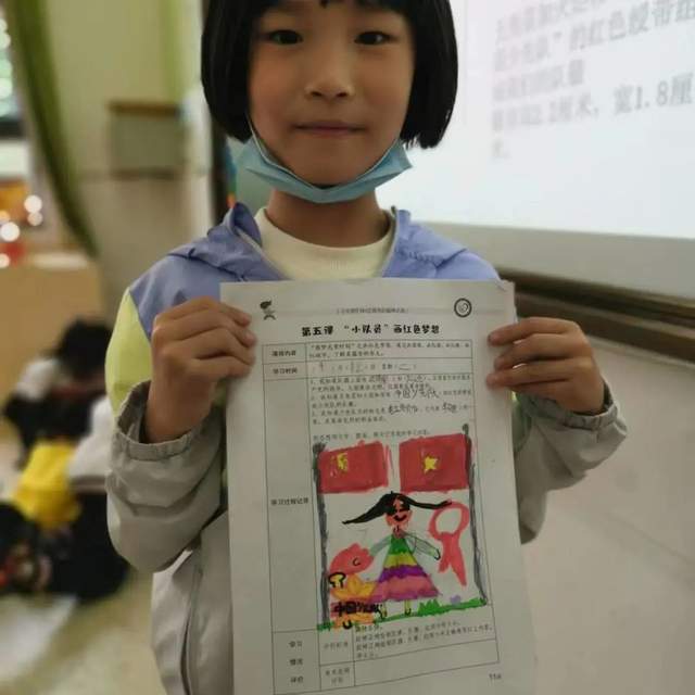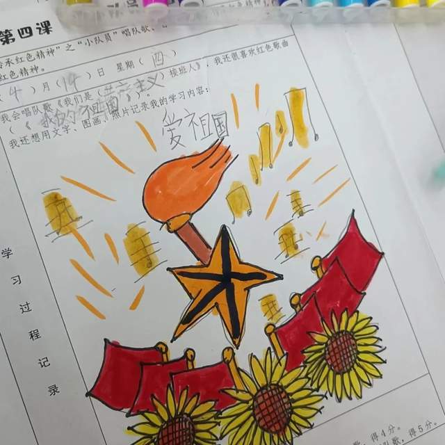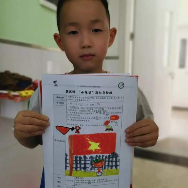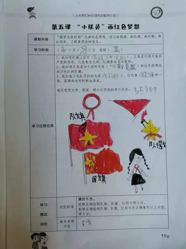 “圆梦光荣时刻”之画红色梦想,通过画国旗、画队旗、画队徽、画红领巾,了解起蕴含的含义。