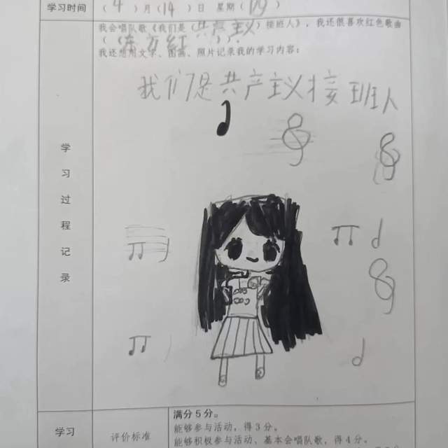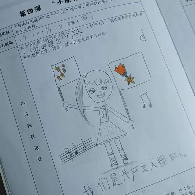 在课堂上,小太阳们认真学唱队歌《我们是共产主义接班人》。