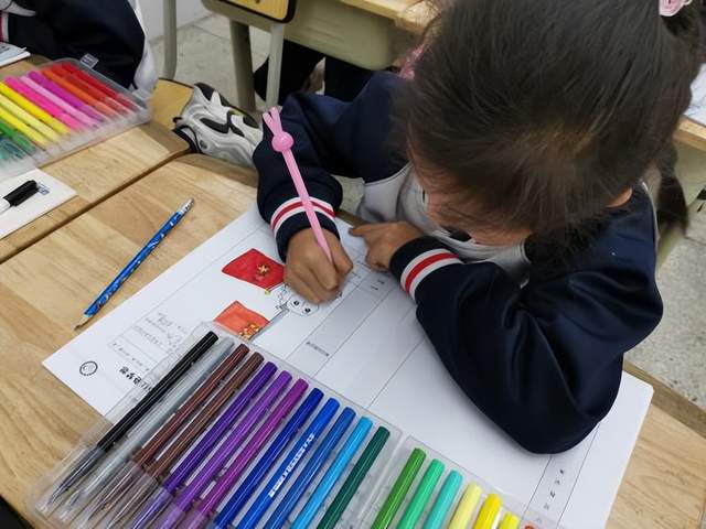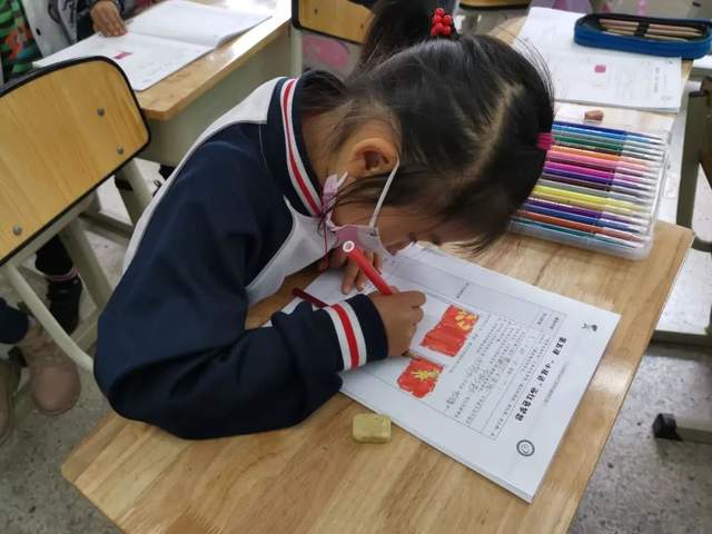 小太阳们认真地画画,了解国旗、队旗、队徽、红领巾的样子和含义。