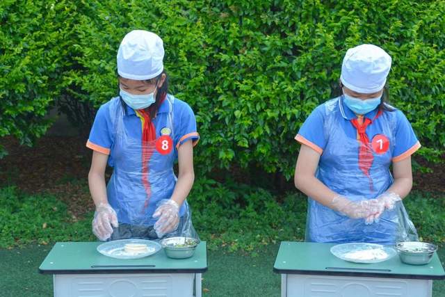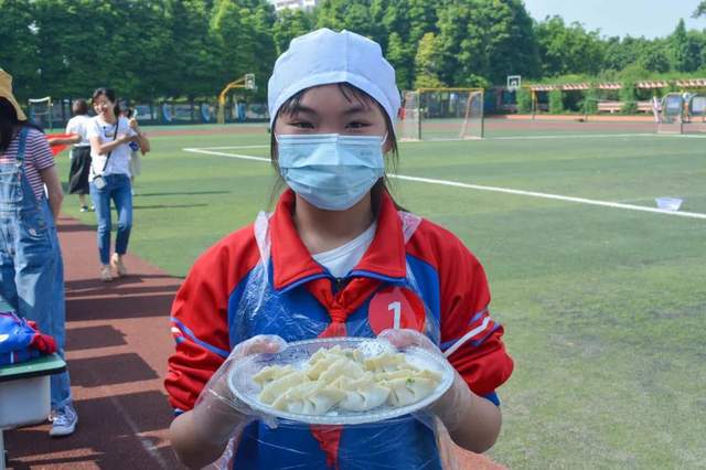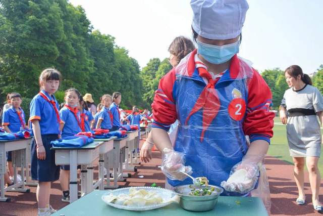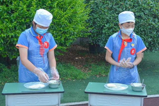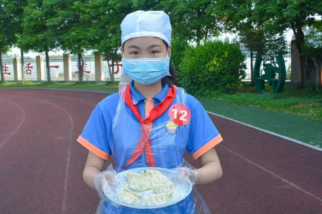 比赛号令一响,只见六年级选手们动作麻利地左手摊皮,右手装馅,再将皮和馅捏紧,整理一下,一个皮薄馅大的饺子便包好了。