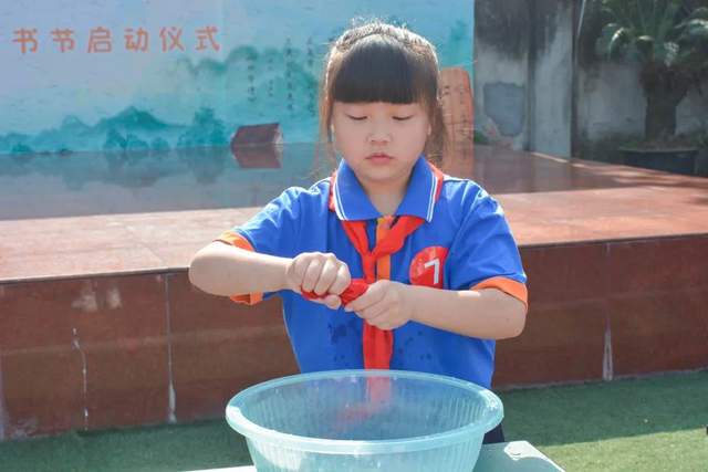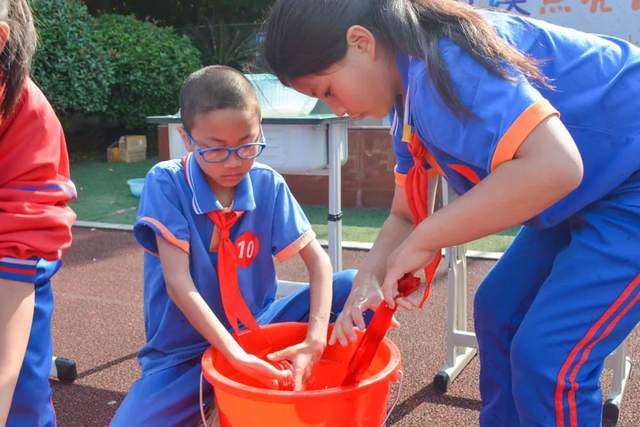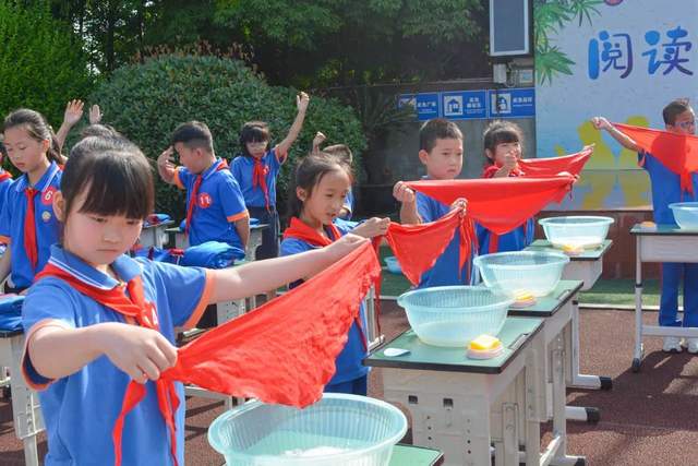 比赛开始了,选手们动作麻利地将红领巾浸湿、抹皂、搓洗、漂洗,一个个动作娴熟,神情专注。