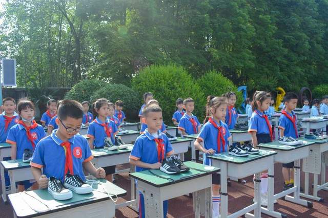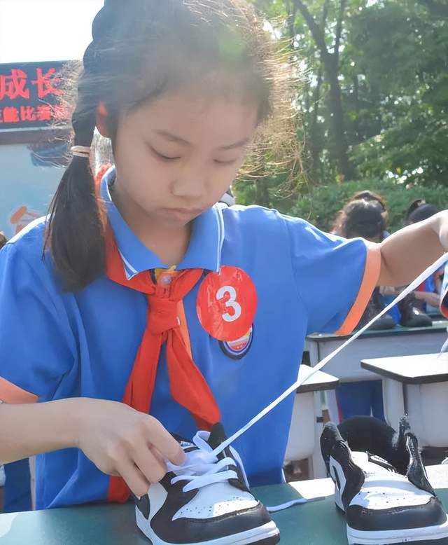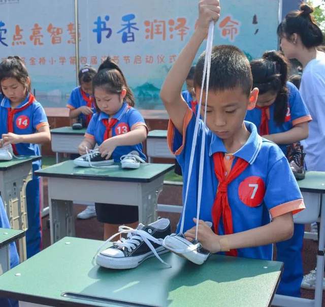 哨声一响,二年级小选手们快速地把拆下来的鞋带一个孔一个孔地穿进鞋孔里,再把鞋带系成漂亮的蝴蝶结。一双双小手飞舞起来,一双双系好鞋带的鞋子静静地放在课桌上,仿佛在等待它们的小主人穿上它们,开启阔步天下的美好人生。