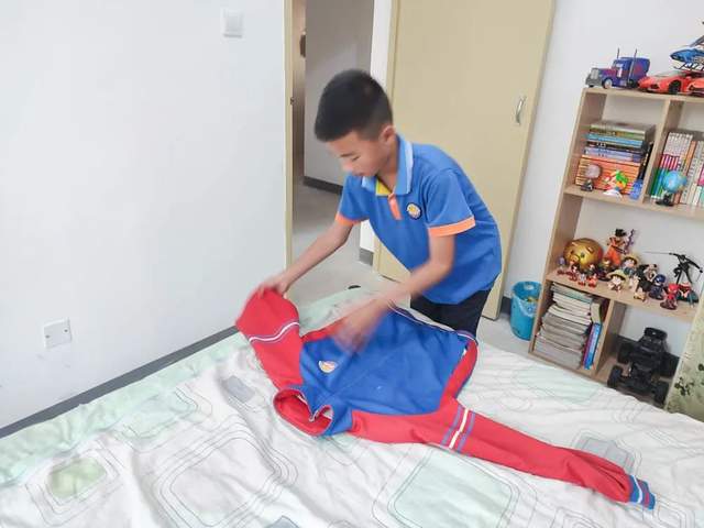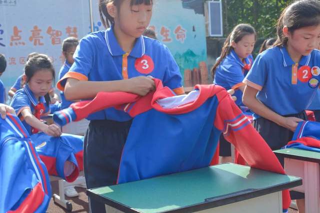 比赛号令一响,四年级的选手们手脚利落地先把要折叠的衣服平铺在课桌上,再“折”“压”“抠”“修”,迅速叠好了衣服。