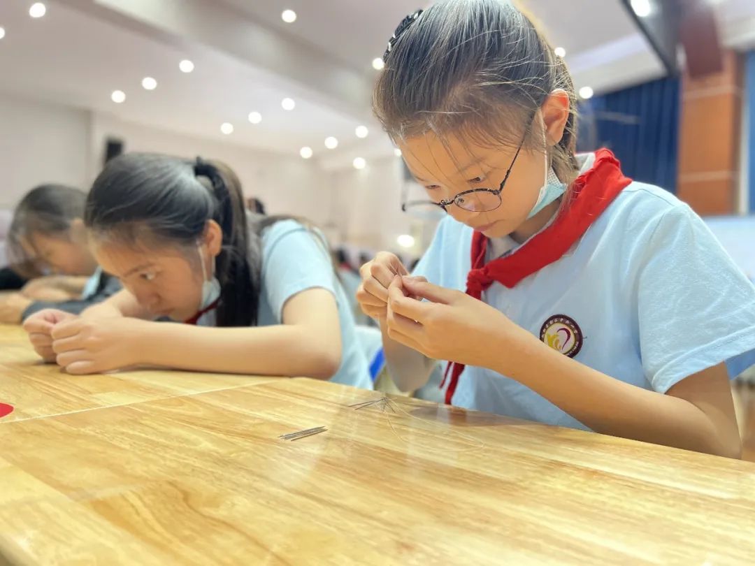 同学们有的眯着眼,有的睁大了眼睛,这是在干啥?哦,原来是五年级的“穿针引线”比赛正在如火如荼地进行呢!有的选手一边穿针,还不忘瞧瞧旁边同学的进度,生怕自己落后了,都争着当“穿针强手”呢!