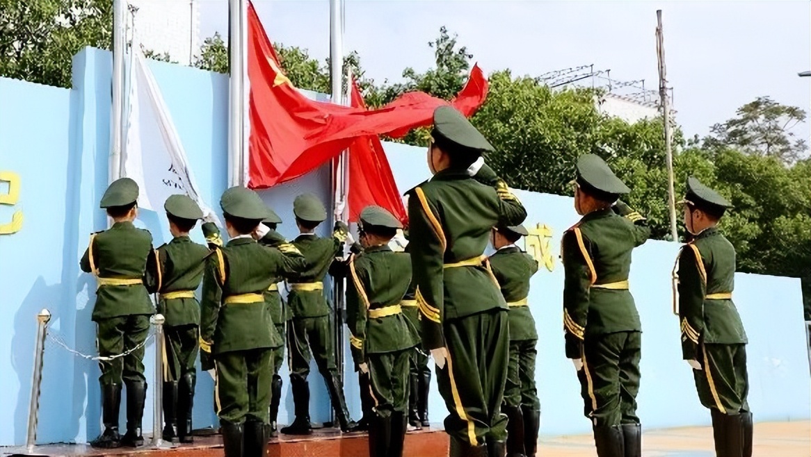 伴随着雄壮的国歌声,国旗护卫队身穿笔挺礼服,脚穿铮亮皮靴,在全校师生的注目下缓缓入场。