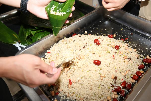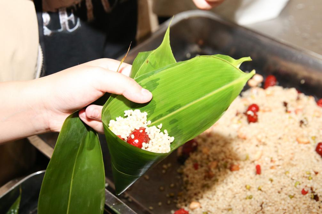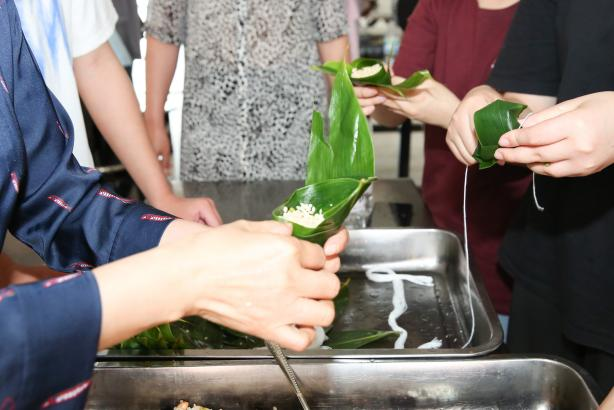 糯米、红豆、红枣、粽叶......看着桌上摆放有序的食材,40余名身着汉服的师生跃跃欲试,大家围着身边的“师傅”们请教,“师傅”们熟练的折粽叶、装糯米、放馅料、裹紧、扎绳......一个个玲珑秀气的粽子便呈现在眼前,引得“徒弟”们一阵惊叹,而“徒弟”们一上手,才发现包粽子并不是一件容易的事。