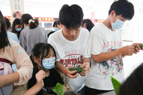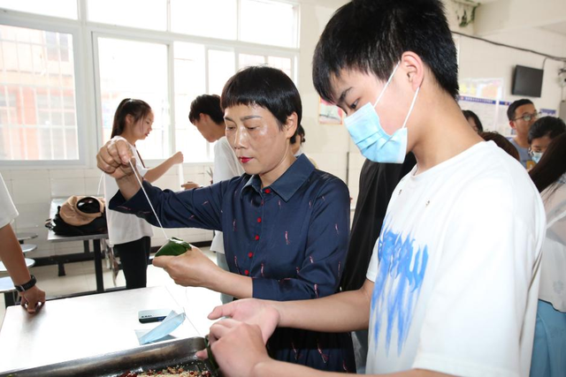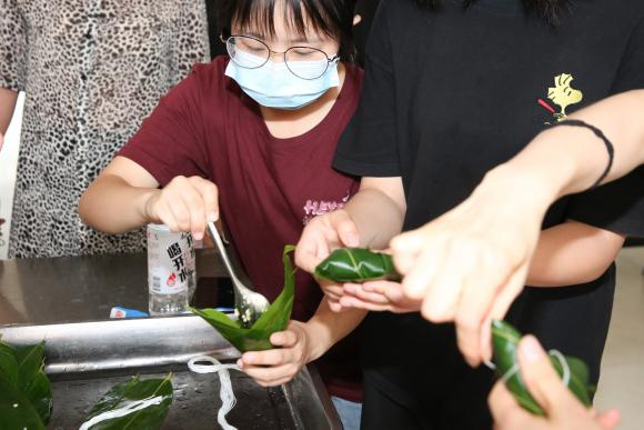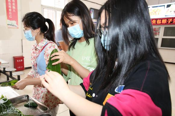 结果虽甜,过程不易。“师傅”们手把手地教,“徒弟”们一招一式地学。大家边包粽子,边唠“家常”,谈笑间一个个可爱、鲜绿的“生命”就在这一道道有条不紊的工序中诞生了,几个粽子包下来,同学们也都找到门道,变得“熟能生巧”,手势也显得有模有样。