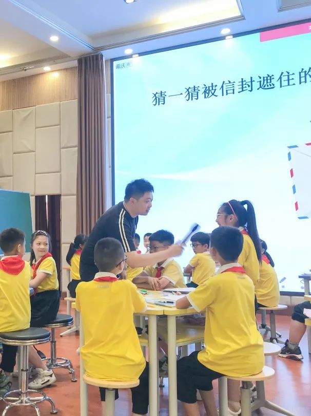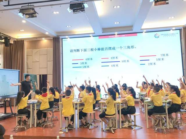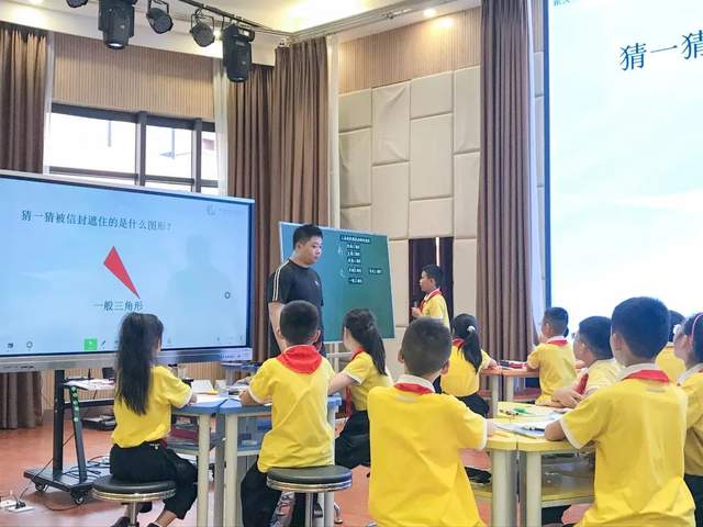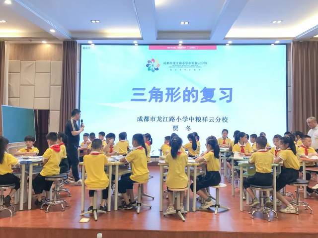 第二节课是由龙江路小学中粮祥云分校教师服务中心主任贾冬为四年级的学生带来的《三角形综合复习》一课。贾老师通过猜三角形的小活动,引出了三角形的定义、分类、边的关系以及三角形角度的计算,帮助学生构建了整个三角形的知识体系。