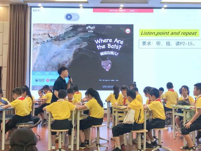 活动伊始,龙江路小学中粮祥云分校英语教师邱博爱为五年级的学生带来了《happy reading》一课。课堂上,邱老师通过科普小知识,画简笔画,排演小短剧等活动,为学生介绍了蝙蝠的习性以及捕猎的方式。