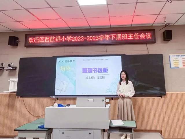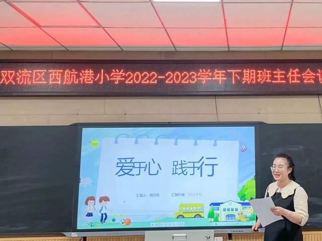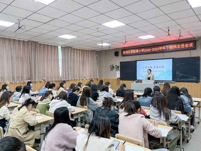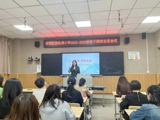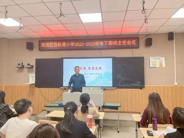 春雨润心田,奋斗正当时。为了进一步加强德育工作管理,明确班主任工作职责,进一步增强班级管理工作的针对性和实效性,提高学校德育工作和班级管理水平,充分发挥班主任的重要作用,2023年4月13日,成都市双流区西航港小学召开以“立足常规 智慧治班”为主题的全体班主任工作培训会。西航港小学夏伶俐校长、李开祥副校长、德育处温蓉主任、学校全体班主任参与会议。