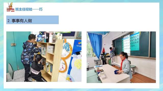 杜老师还通过引导教育和设置书包柜管理员等方法来让孩子们自主管理书包柜,有序规范地放置书包。开学两个月,书包柜不仅美观整齐,教室看上去更加整洁,也培养了孩子们的自我管理能力,责任意识。
