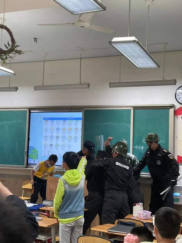 歹徒在阶梯教室前的空地上和我们的保安人员进行殊死搏斗的过程中,抓住保安人员的一个疏漏,窜至教学区,进到了一间教室。发现“不速之客”,正在上课的老师并没有太多的惊慌,第一时间操起凳子勇敢地和歹徒对峙,同学们利用平时在安全课堂上学到的知识进行防爆:有的钻到桌下,有的从教室的另一个门跑出教室,有的迅速拿起书包挡在胸前......歹徒正要对教室里的一个同学痛下毒手时,被紧随而来的保安人员制服。