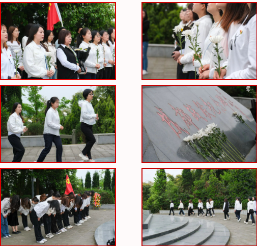 碧血丹心照汗青,擎旗自有后来人。带着对烈士的崇敬,党员老师们跨过位于将军沟上的石桥,拾级而上,来到了成都战役烈士陵园内。松柏苍翠,绿草芳菲,安谧肃静,整齐排列的黑色碑石静默无言。在党支部书记周晓玲的主持下,全体党员整理着装,轻抚党徽,面向纪念碑肃然静立,举行祭奠仪式。而后,周晓玲书记带领党员教师向烈士碑敬献鲜花,表达敬意;齐唱国歌,坚定对祖国的信念;绕场一圈,瞻仰纪念碑。