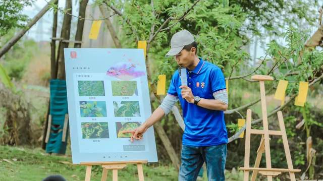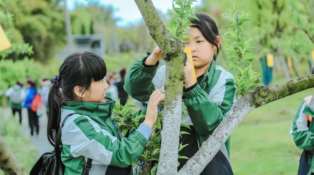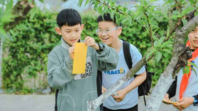 孩子们在教官的带领下来到北门桃林和葡萄长廊柚子林,学习植物的病虫防害知识,并在领队老师的带领下亲自为桃树和柚子树挂上防虫药贴。
