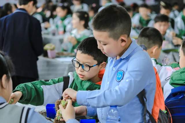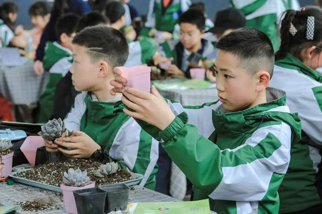 感受了川剧的魅力,孩子们来到多肉种植棚。领队老师详细地给孩子们讲解了多肉繁殖的相关知识:多肉植物十分顽强,脱盆后放置几个月仍可以存活。落下的一片叶子,掉在土地上,它就可以自己生根、发芽,然后在掉落的叶子上开花,长成一株新的多肉。有的多肉茎秆出了问题,被削掉了一半,剩下的一半仍然可以茁壮成长。为了让孩子们更好地感受多肉的顽强生命力,老师带领大家各自亲手栽种了一株多肉!