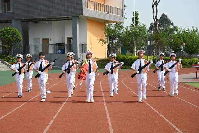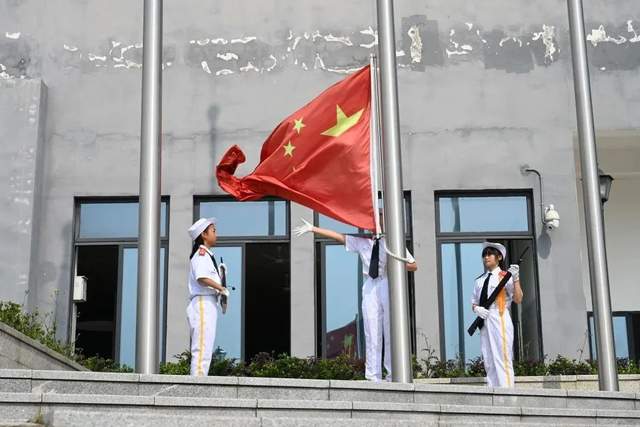 微风徐徐,碧空如洗。升旗仪式开始,国旗护卫队昂扬挺胸,迈着铿锵有力的步伐送国旗缓缓走向国旗台。