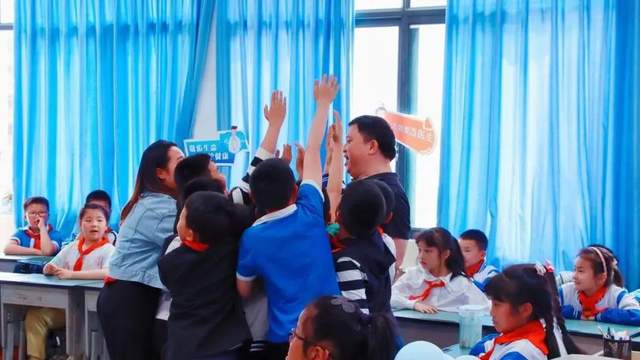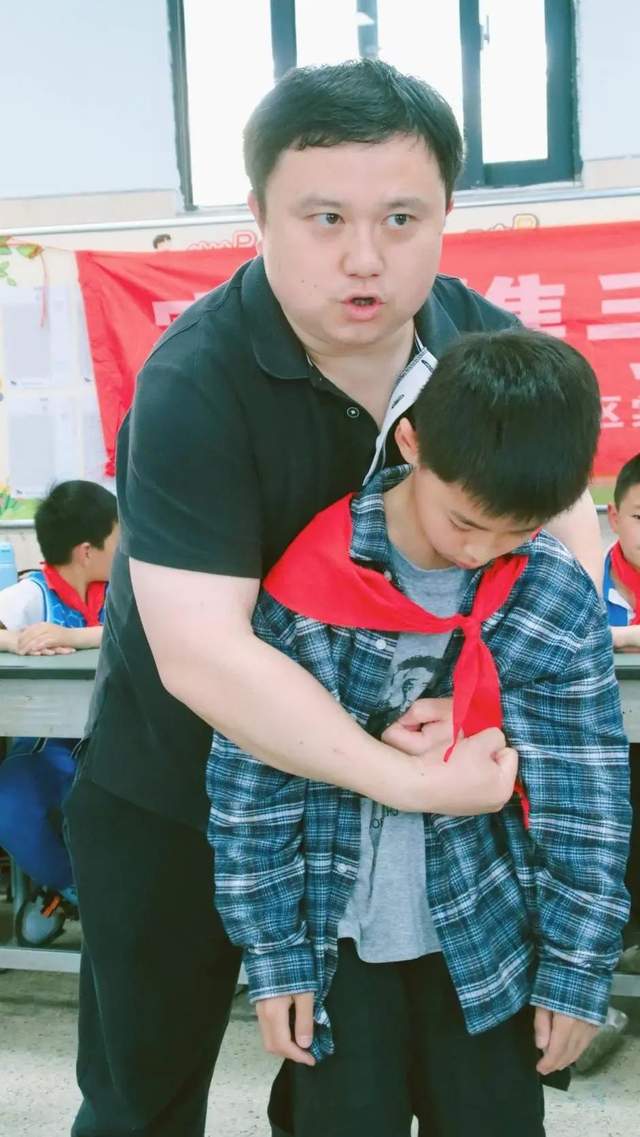 讲解海姆立克急救法时,钟爸爸现场邀请了⼏位同学来做演示,同学们跃跃欲试,争先恐后地冲到钟爸爸身边去做演示。