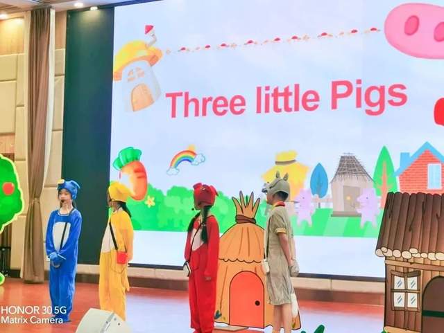 《三只小猪》,讲述了三只小猪在长大后,学好了本领各自盖了不同的房子,却遭遇大灰狼的故事。这个故事教育孩子做人要勤劳肯干,聪明机智、乐于助人。三年级的小演员们惟妙惟肖的表演,为现场增光添彩。