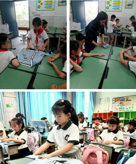 整理和清洁,看似简单的体力劳作,实则蕴含着深沉的人生智慧。瞧,家长们带领孩子学习如何收纳整理桌子、学习叠衣服,还有家长带着孩子们动手洗小手帕。孩子们积极发问,勤于探究,不断加深对收纳和清洁的理念。“类似的东西放在同一个区域”“能立放不叠放”“拧干的时候要对折”……同学们边听边记录,一个个创意迸发心间,认真专注的目光下,一颗颗热爱劳动的种子正在发芽、生长。