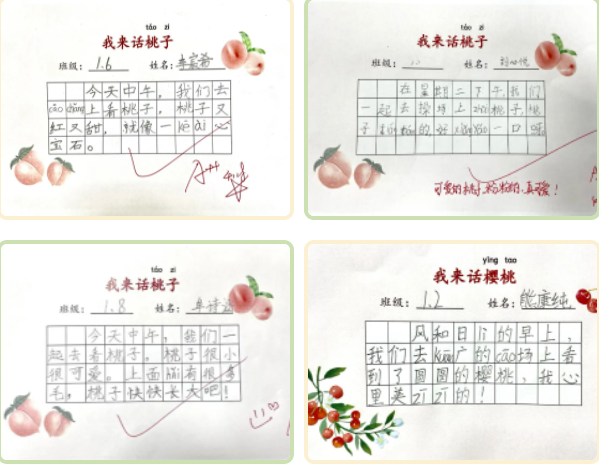 美景不只是用来欣赏,它还能孕育出颗颗充满爱与创造的心,用眼去发现美,用笔去书写美,更用心去分享美。在一棵棵果树下“春天的写话”正在进行,能能娃们用稚嫩可爱的语言纷纷书写出对小果子们的喜爱。