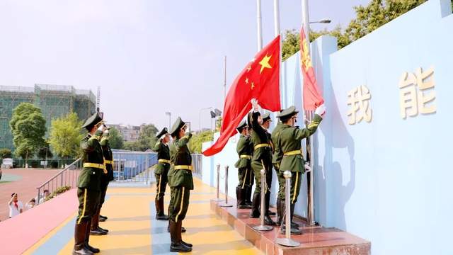伴随着出旗曲,国旗护卫队的队员们拥护着鲜艳的五星红旗,踏着铿锵有力的步伐,向升旗台缓缓走来。