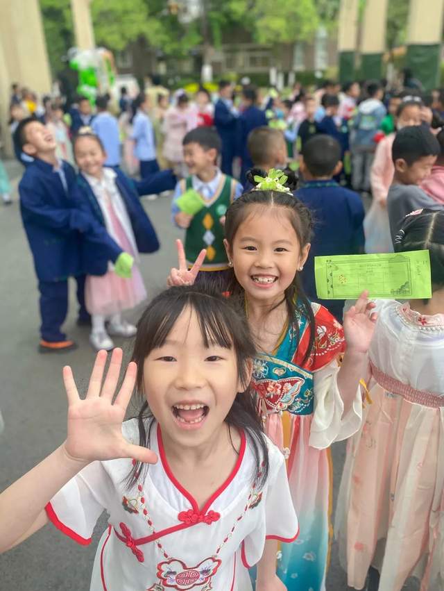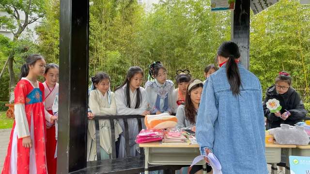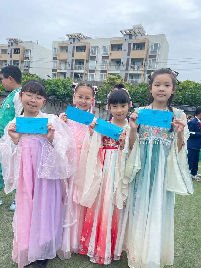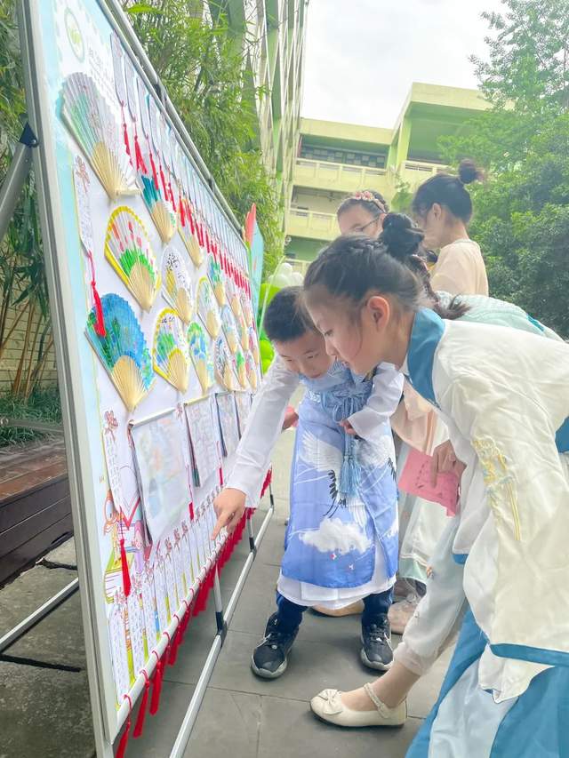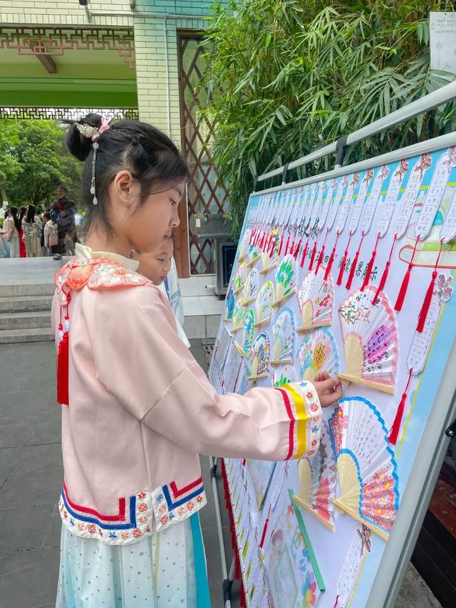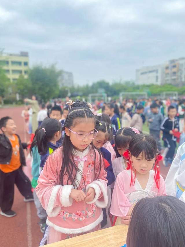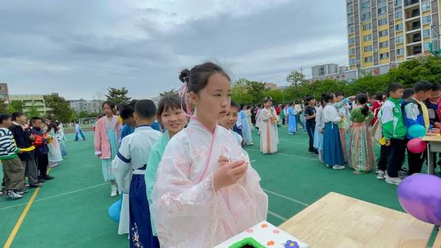 双华小学的竹溪亭畔、篮球场里,六年级的阅读检阅点前迎来了身着汉服的孩子们。