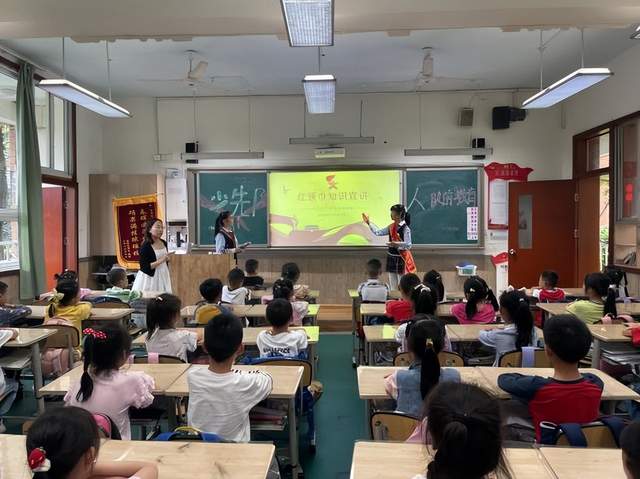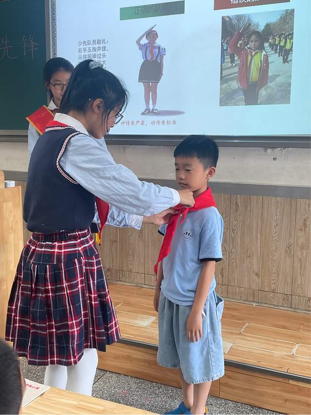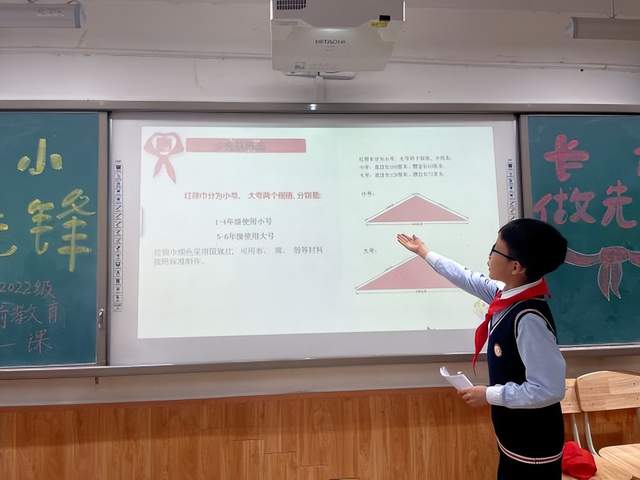 红领巾宣讲队员们激情洋溢地向同学们介绍了少先队的队名、队旗、队徽以及少先队的标志——红领巾,并在课堂上现场演示、分步讲解佩戴红领巾和敬队礼的方法。小朋友们个个精神饱满、身姿挺拔、手势正确。虽然可能略显稚嫩,却依然能感受到孩子们的学习热情。红领巾是红旗的一角,是革命先烈的鲜血染成的,努力争当少先队员的意识已在孩子们心中埋下了一粒粒种子。