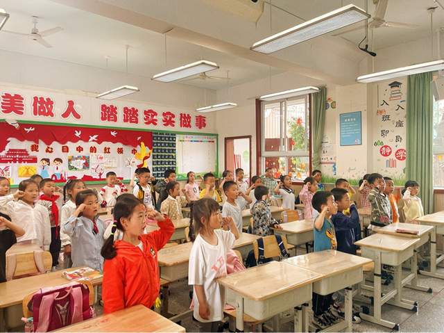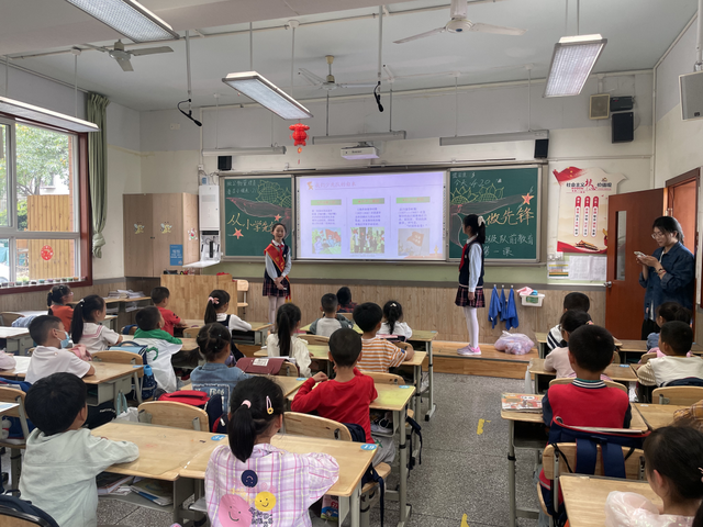 能戴上红领巾,成为光荣的少先队员,是每一个小朋友盼望的事。想要加入中国少年先锋队,成为一名优秀的少先队员,就必须了解少先队的由来。红领巾宣讲队员们将党的百年历史娓娓道来,从新民主主义革命时期的劳动童子军、共产儿童团、抗日儿童团、地下少先队等少年儿童革命组织到1949年10月13日中国少年先锋队的成立。曲折漫长的历程道不尽峥嵘光辉的历史,道不尽中国少年先锋队顽强的精神。一年级的预备队员们坐的端端正正,听的专心致志,一双双炯炯有神的眼睛期待渴求着更多的知识,小手举得高高的争着回答问题。