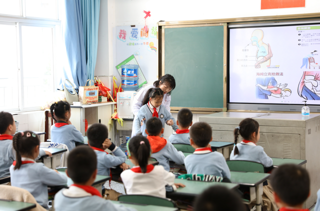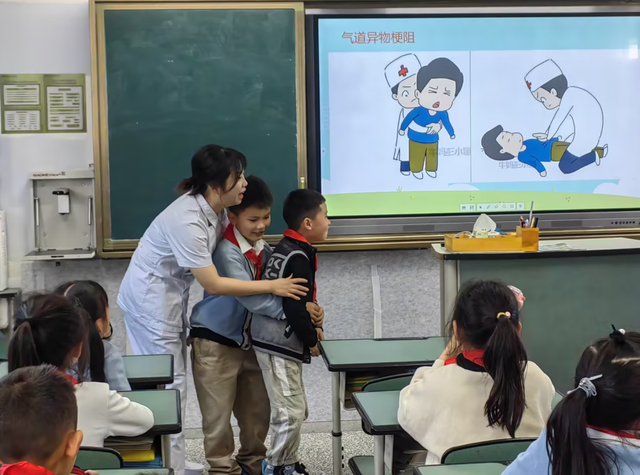 还有的家长用生动形象的实际操作,带学生一起学习急救技能,如海姆利克急救法。这是一种专门抢救急性呼吸道被异物阻塞从而引起呼吸困难的方法,是目前世界上公认有效的抢救方法之一。家长们耐心地给孩子示范,教孩子如何用正确的动作进行海姆利克急救。这一急救技能与日常生活息息相关,既让同学们意识到了生命的可贵,又帮助同学们学习了常用的急救知识。