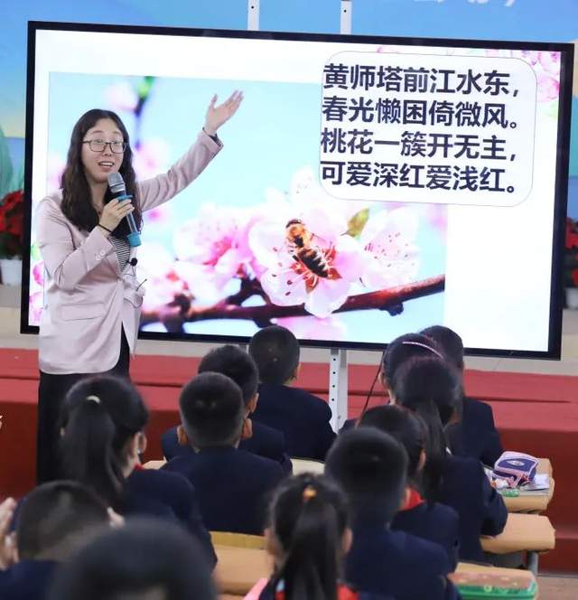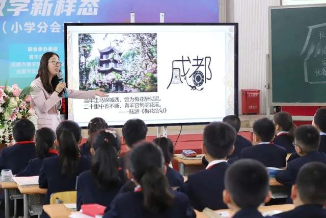 活动中,南湖小学语文教师钟婷婷结合2022年新课标中学习任务群的指导,将成都文化和诗词结合,以“文学阅读与创意表达”任务群为组织形式,给实小(西区)的孩子们带去了一节诗情画意的古诗词拓展阅读课《杜甫与成都》。诗圣的千古名篇、成都的文化风情、古诗词学习的方法在课堂上充分融合,更滋润了孩子们热爱家乡文化的心灵。