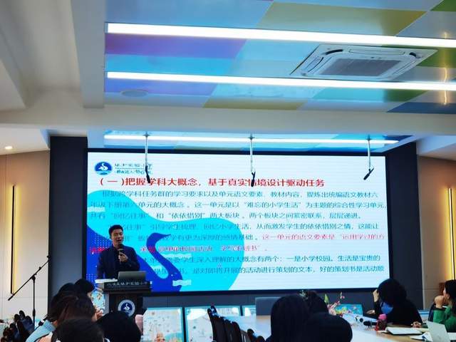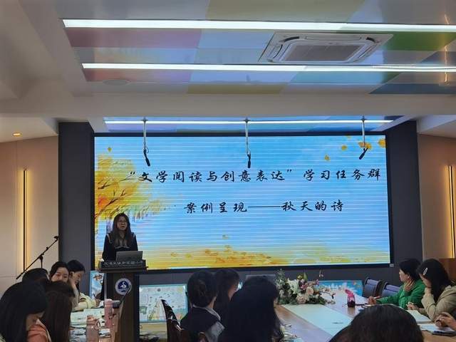 此次活动的主要内容是六个年级组分别对六大学习任务群案例进行评析。罗飞扬老师以《秋天的诗》为例,评析了“文学阅读与创意表达”学习任务群;汤梦莹老师以《做一本童年诗集》为例评析了“语言文字积累与梳理”学习任务群,同时还对案例中学习内容的选择方式、教学活动的设计等提出了思考,引发了老师们的感悟。