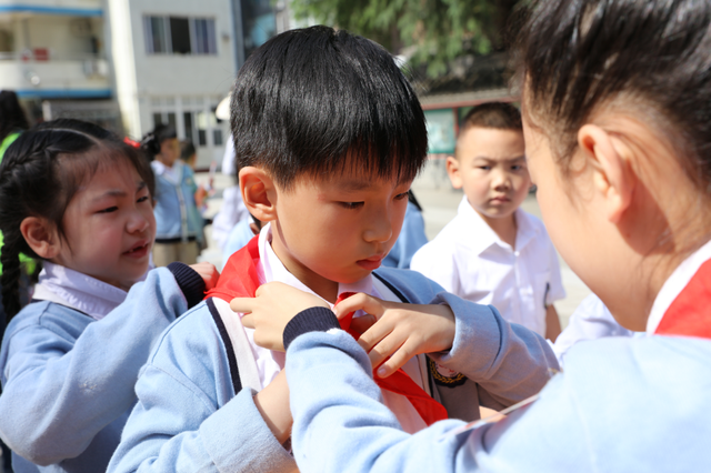 看,他们用灵巧的双手一搭、二绕、三穿、四拉,红领巾就系好啦!再来比比谁的队礼最规范吧!一个个挺拔的身姿,一道道坚定的目光,一只只高举过头顶的小手,从孩子们身上我们看到了传承和涌动着的红色力量。