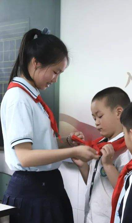 队员们向一年级的小朋友讲解了怎样敬队礼,红领巾怎么戴,如何唱队歌和背入队誓词。小小辅导员在弟弟妹妹们的实际操作中耐心指导,及时纠正,努力引导一年级的小朋友向一名光荣的少先队员一步步迈进。