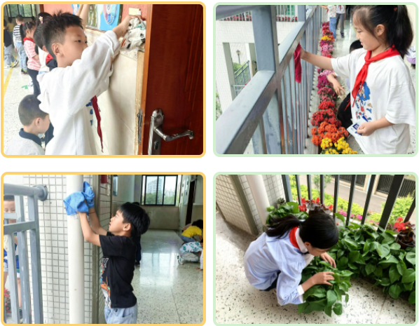 其余的能能娃也没有闲着,他们展开了一场如火如荼的校园大扫除活动。在各班老师的组织下,大家干得热火朝天,一双双灵巧的小手在擦窗户、扫地、整理书架……活动中大家分工明确,责任清晰,校园的每一处都有孩子负责,把校园的每个角落都打扫得干干净净,整个校园因为能能娃们的辛勤劳动而更加美丽,每一位负责的老师也在为孩子们点赞!