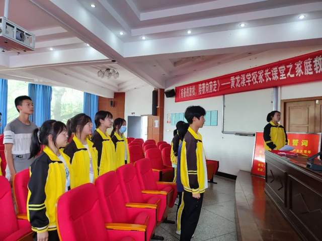 活动在雄壮的国歌声中拉开序幕。黄龙溪学校德育处高秋菊老师宣读了新团员名单,他们是来自八年级和九年级的杨莎莎、毛弋坤、陈炜杰、罗祎恒、罗炜杰、王子颜、李欢七位同学。随后,老团员为新团员佩戴团徽。中国共产主义青年团团徽是中国共产主义青年团的象征和标志,从佩戴上团徽那一刻起,团员们要清楚自己肩负的责任,用实际行动来传承中国力量,把青春融入中国梦,立志成为优秀的共青团员。