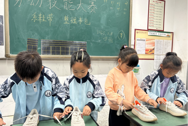 一年级小朋友在老师们的精心组织下,大显身手。比赛口令吹响,同学们争分夺秒的将手中的鞋带娴熟穿进鞋子里,别看我们才上一年级,劳动起来可一点也不逊色。这边穿着鞋带,那边的竞争小对手已经开始麻溜地收拾起书包,小书重大书,接着把物品分门别类地装进书包的各个区域里……比赛现场热火朝天,小朋友们聚精会神,生怕浪费一秒时间,每个班都诞生了不少的“劳动小能手”,欢笑声洋溢在整个校园里,劳动让我们收获成长,更让我们收获欢乐。