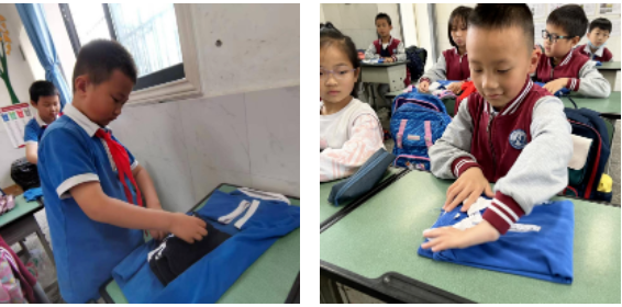 二年级比赛项目叠衣服、系红领巾,教师先讲解比赛规则,比赛前把衣服平放桌子上,统一口令开始叠衣服,老师计时,叠好者举手示意。活动现场,气氛紧张又激烈,每位小选手动作迅速,不甘落后。一只只小手高高举起,脸上绽放出自豪的笑容。孩子们在叠衣服比赛中体验了成功的快乐,增强了自我服务意识。