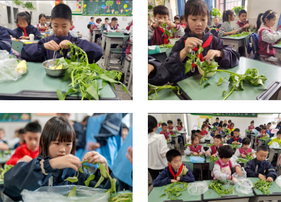 紧接着进行第二项摘空心菜。一根根嫩绿的空心菜摆在桌上,等待孩子们处理,只见一个个劳动小能手飞快地把枯黄的菜叶去除,然后再把空心菜的茎从根部向上剖开,边剖开边截成大约拇指长短一段,一段茎带着一片叶子,整整齐齐装在碗里,没一会儿功夫5根空心菜就已处理完毕,最后,桌面上的残留垃圾都在一双双巧手下清理干净。比赛结束后,同学们将剥好的玉米粒和择好的空心菜带回家,与家长们一起动手,用玉米粒和空心菜制作美味菜肴,分享劳动的果实。