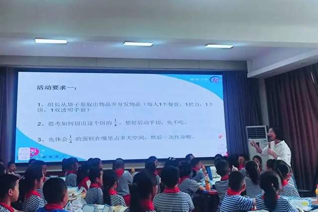 其中,开展了“分饼干”和“分饮料”的活动让本堂课达到了高潮,魏老师引导学生在小组内分一分,尝一尝,使学生进一步体会了分数的意义,在实际操作活动中让学生探索到了平均分与分数的关系。