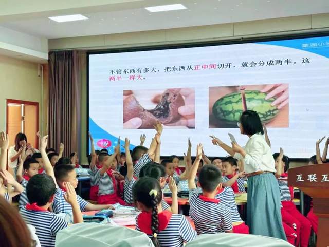 本次送教课程由唐琦教师团队骨干教师魏璐老师执教,课程内容为三年级数学下册《分一分(一)》,魏老师首先结合学生的生活实际,运用“分苹果”的活动引入新课,通过直观形象的学具操作等形式,激发学生学习兴趣,使学生积极主动参与学习,学生感知“一半”可以用分数二分之一表示时,初步理解分数的含义。