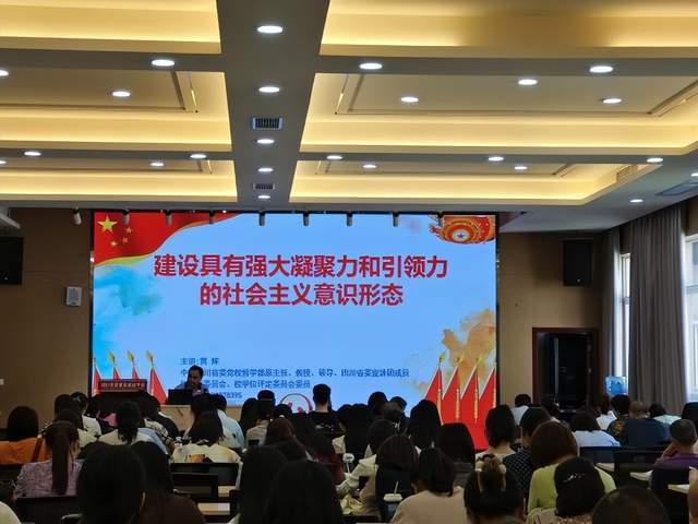 黄辉教授以《建设具有强大凝聚力和引领力的社会主义意识形态》为题作专题讲座。他通过丰富的案例阐述了意识形态事关党的前途命运、事关国家长治久安、事关民族凝聚力和向心力的重要地位和作用,指出教育工作者必须坚持培育和践行社会主义核心价值观,把培养担当民族复兴大任的时代新人作为重要职责,努力使社会主义核心价值观落细落小落实。