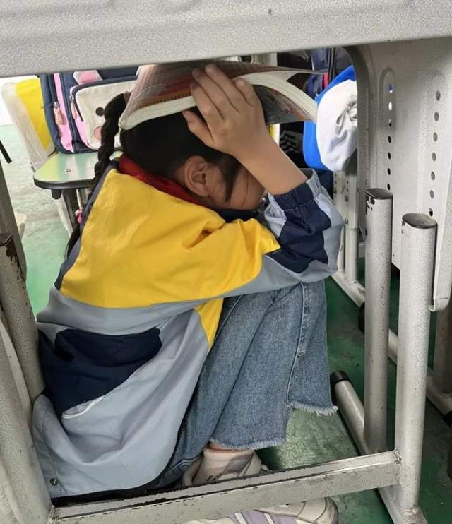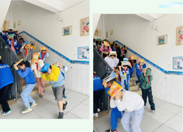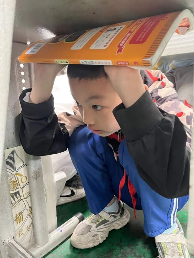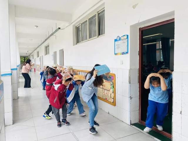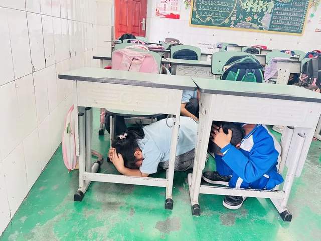 随着第一声警报声响起,地震疏散演练开始,各岗位人员快速到位,各班老师立即告知学生“地震了,不要慌!”第二声警报响起,教师立即指挥学生紧急避险,指导学生双手抱头,躲到安全区。