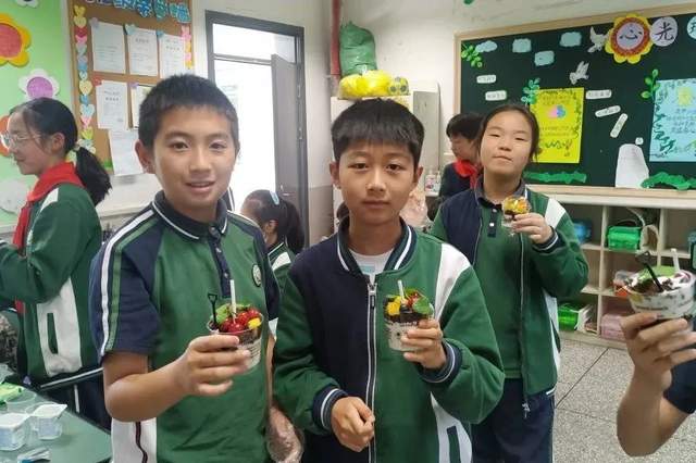 看完了视频后,晨汐妈妈在讲台上开始按照步骤细心的为同学们一一讲解,先在杯子里面的底部挤上奶油,然后放第一片蛋糕,再挤上奶油,放入水果……制作过程中充满欢声笑语、同学们学得不亦乐乎,孩子们还可以根据自己的喜好选择不同的水果,制作出了不同口味的蛋糕。