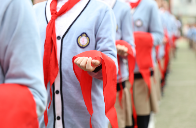 高年级的哥哥、姐姐为新队员们佩戴上鲜艳的红领巾。这一条条用英雄的鲜血染成的红领巾,是那么的美丽而又神圣,它系在大家的胸前,也绽放在大家的心间。红色接力棒,星火代代传!